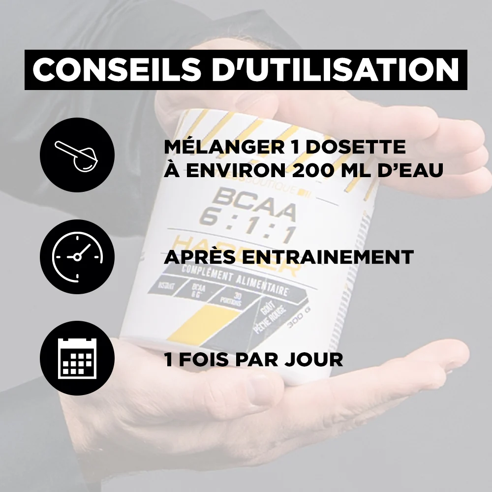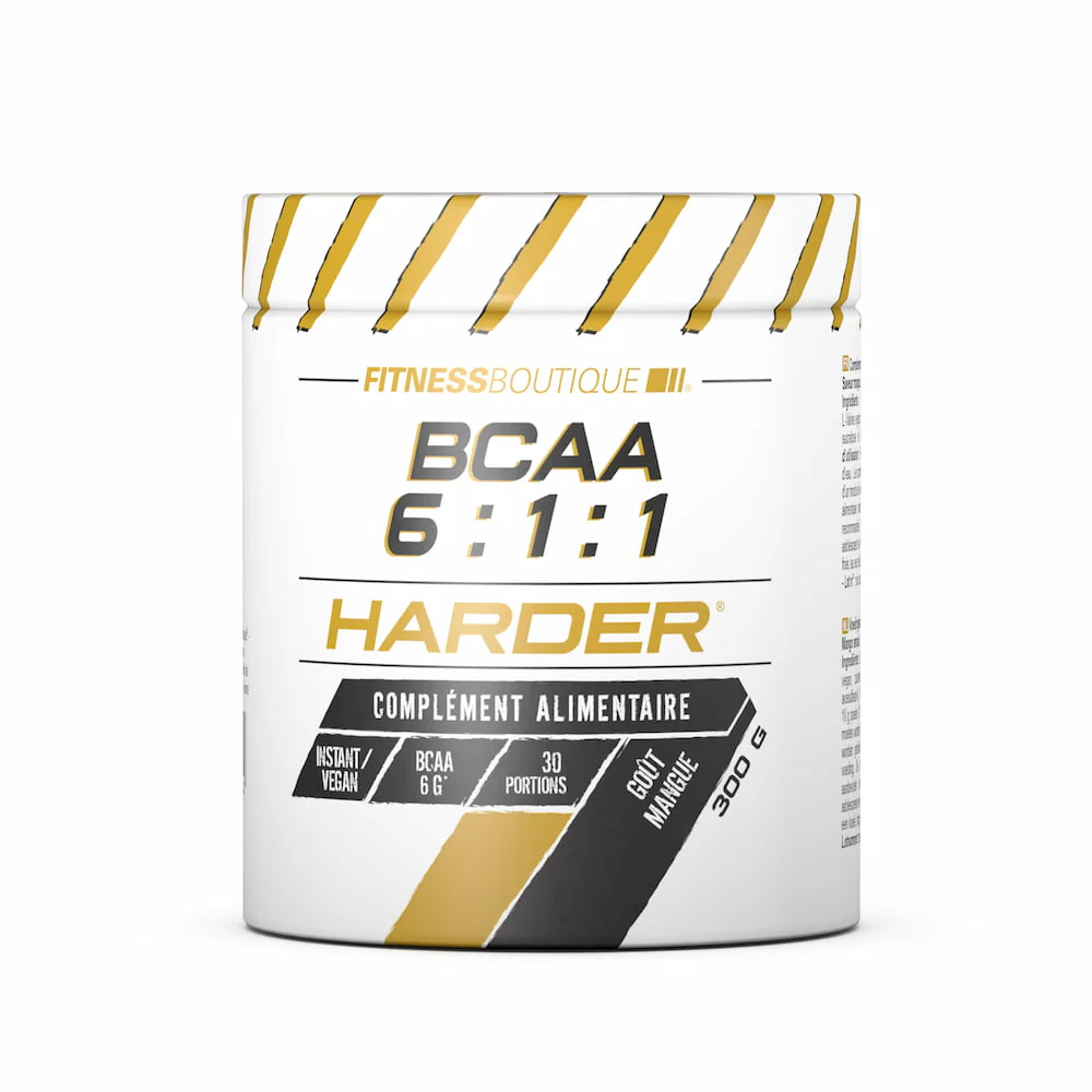 BCAA Vegan 6:1:1 d’HARDER sont constitués d’acides aminés branchés : L-Leucine, L-Isoleucine et L-Valine dans un ratio 6:1:1.
