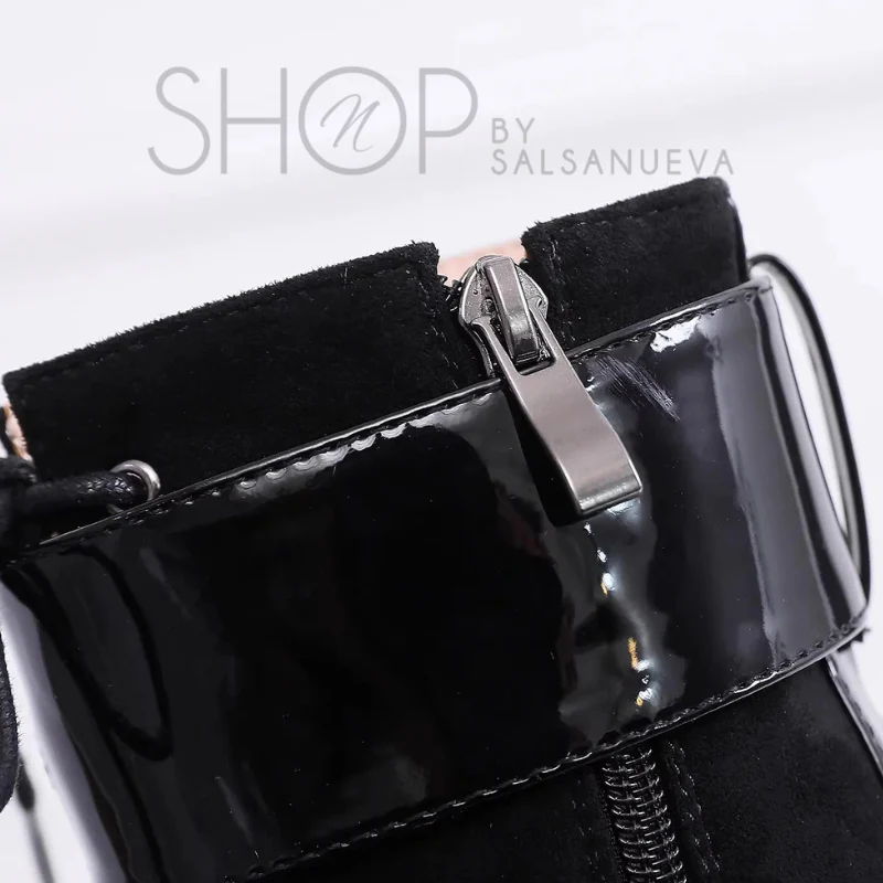 Ligne haute et laçage intégral : La coupe montante gaine la jambe et souligne la silhouette. Le laçage permet un ajustement précis sur tout le pied.
