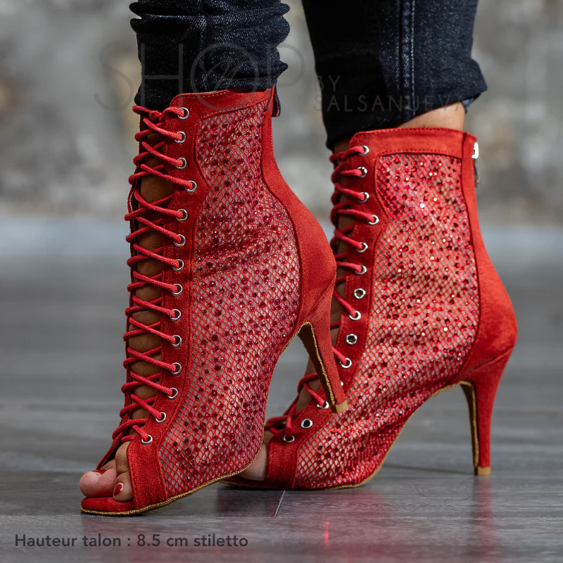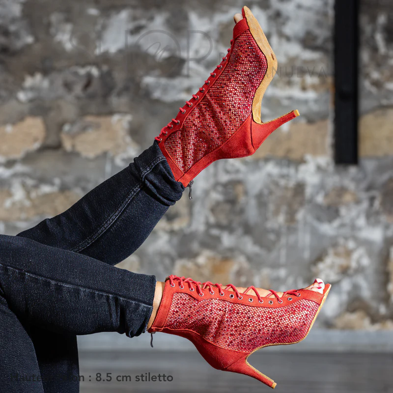 Éblouissez sur la piste de danse avec nos Bottines Heels Rouge Strass SalsaNueva. Conçues pour les danseuses passionnées qui veulent briller tout en restant confortables, ces bottines allient élégance et confort pour tous vos cours de heels et vos soirées.