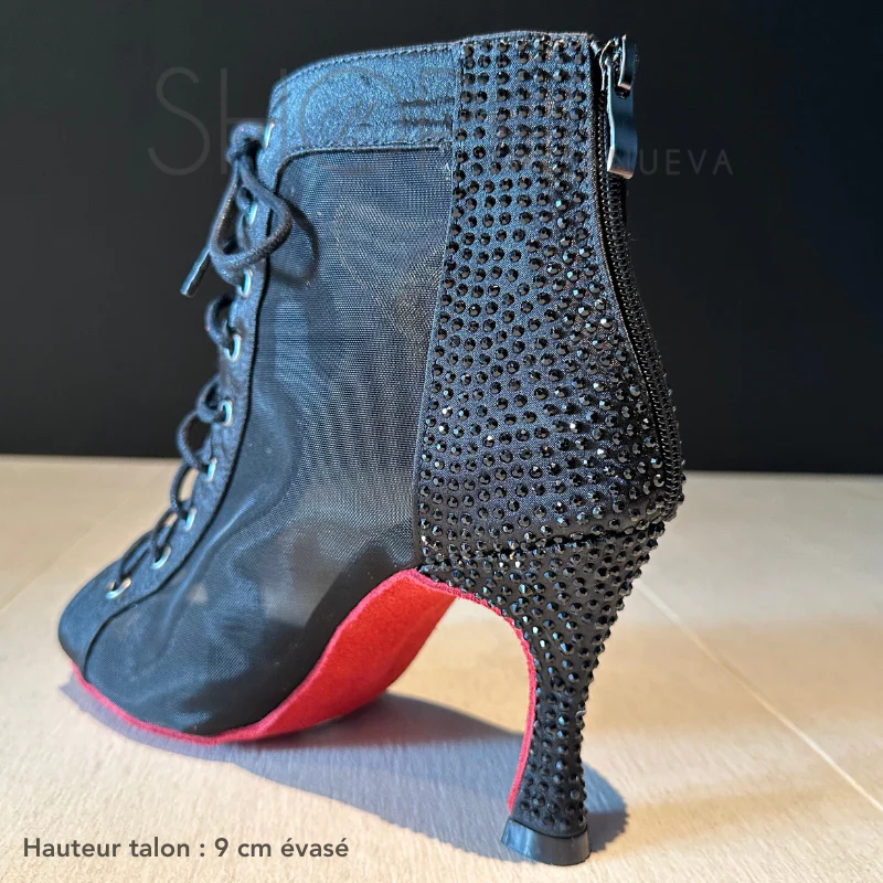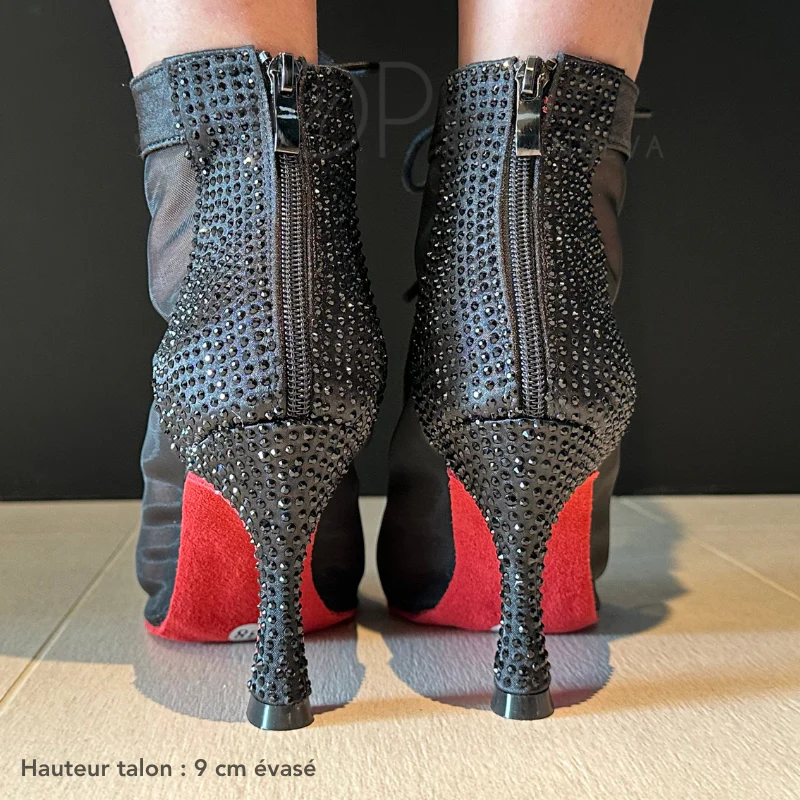 Illuminez la piste de danse avec les Bottines à Talons Noirs Strass Subtil de SalsaNueva. Ces bottines captivantes sont conçues pour les danseuses passionnées qui souhaitent ajouter une touche d’éclat et d’élégance à leurs performances.