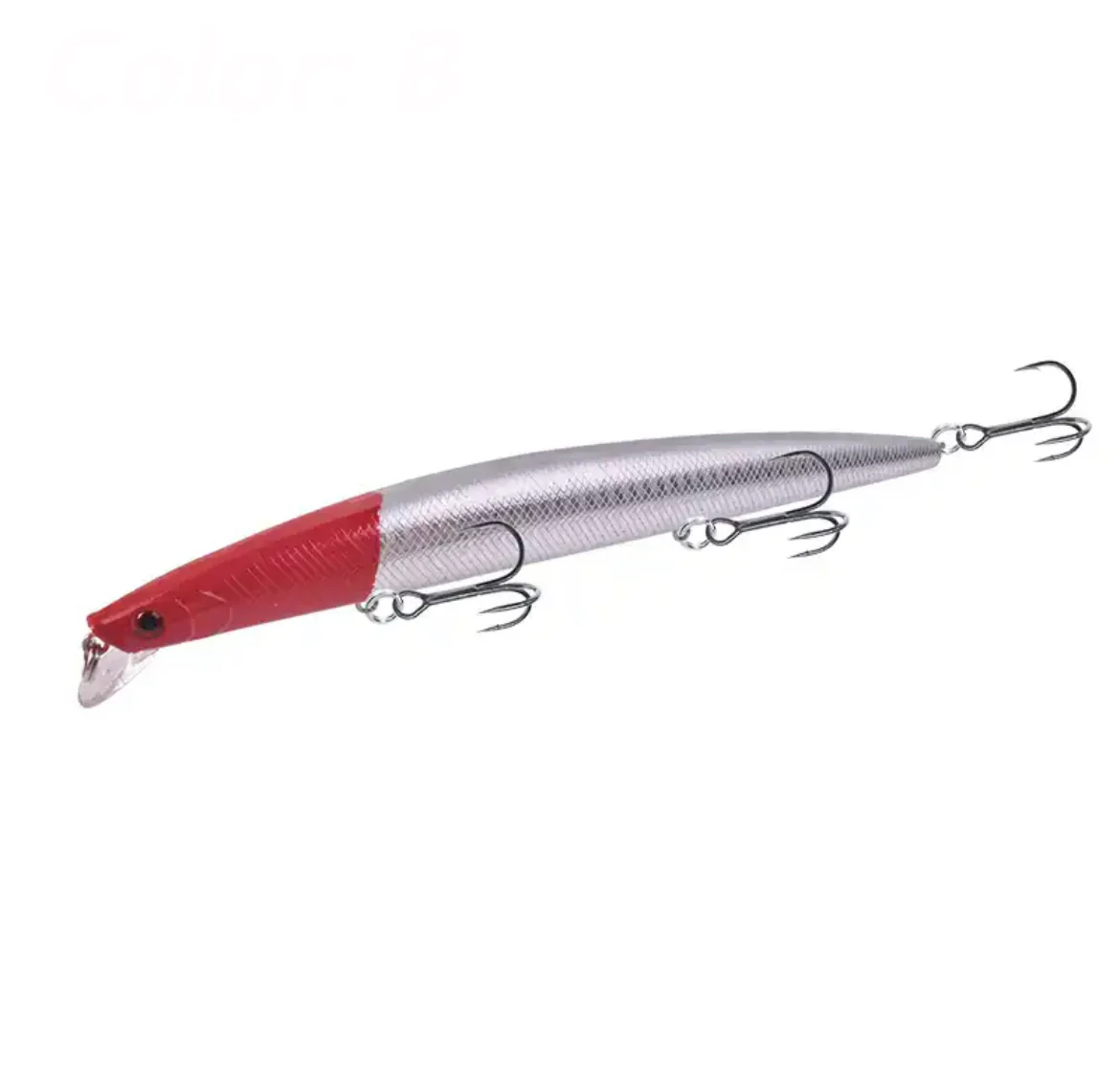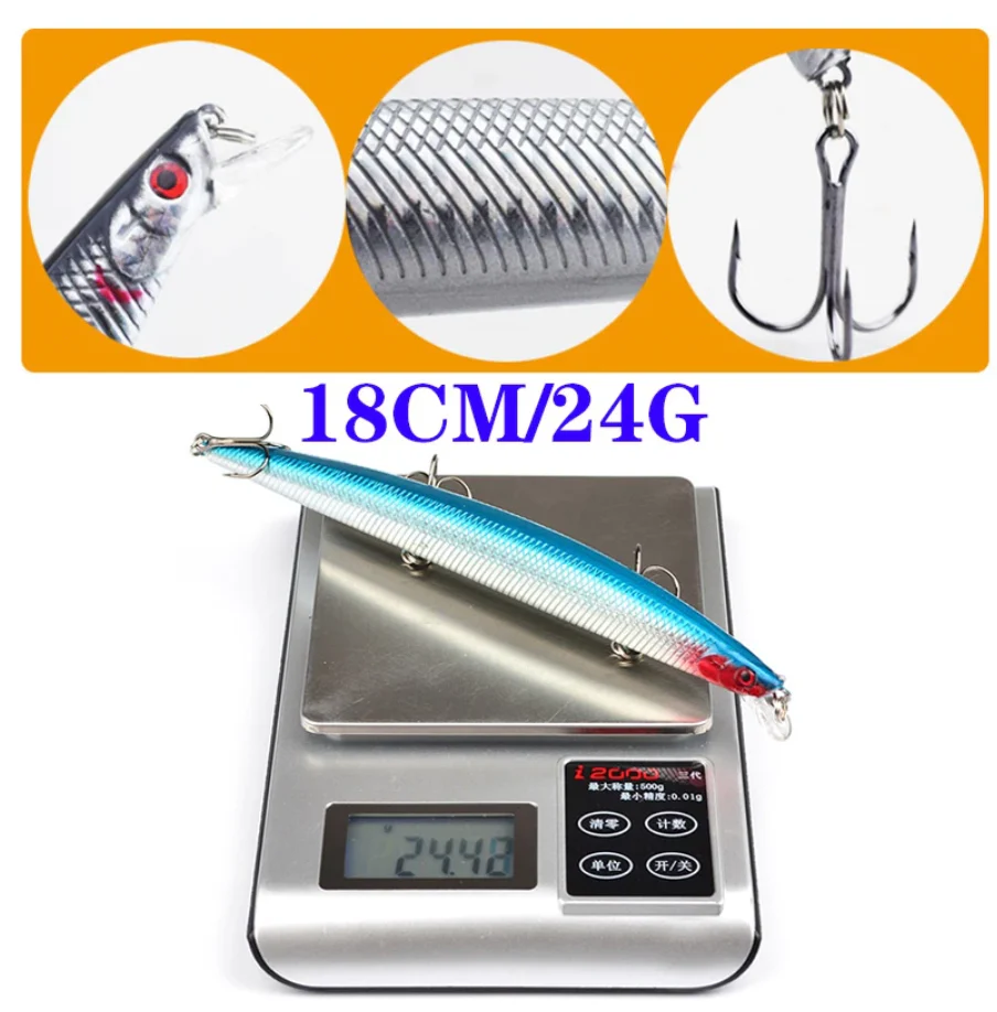 Fabriqué avec des matériaux de haute qualité, notre leurre de surface pour le bar conserve sa flottabilité et sa nage après plusieurs utilisations. Les dimensions de notre leurre flottant sont de 18 cm pour 24 grammes.
