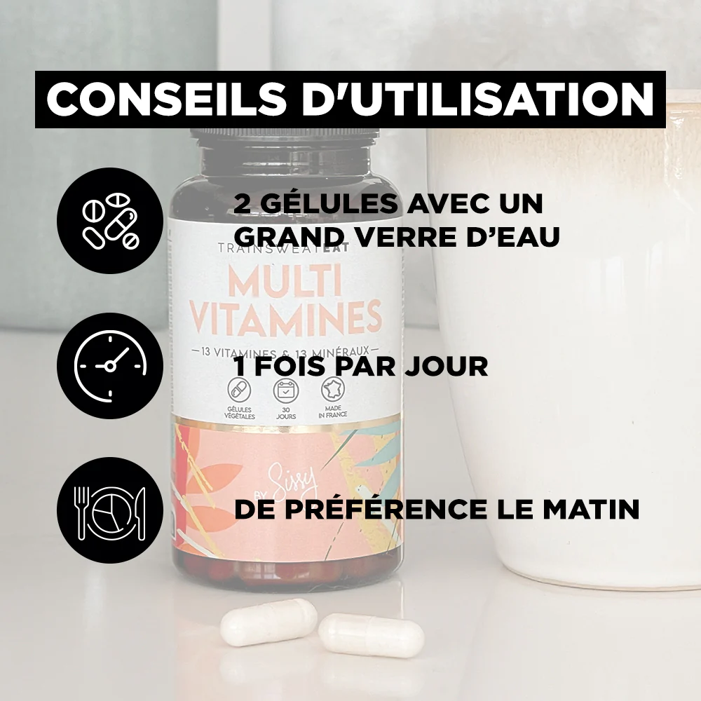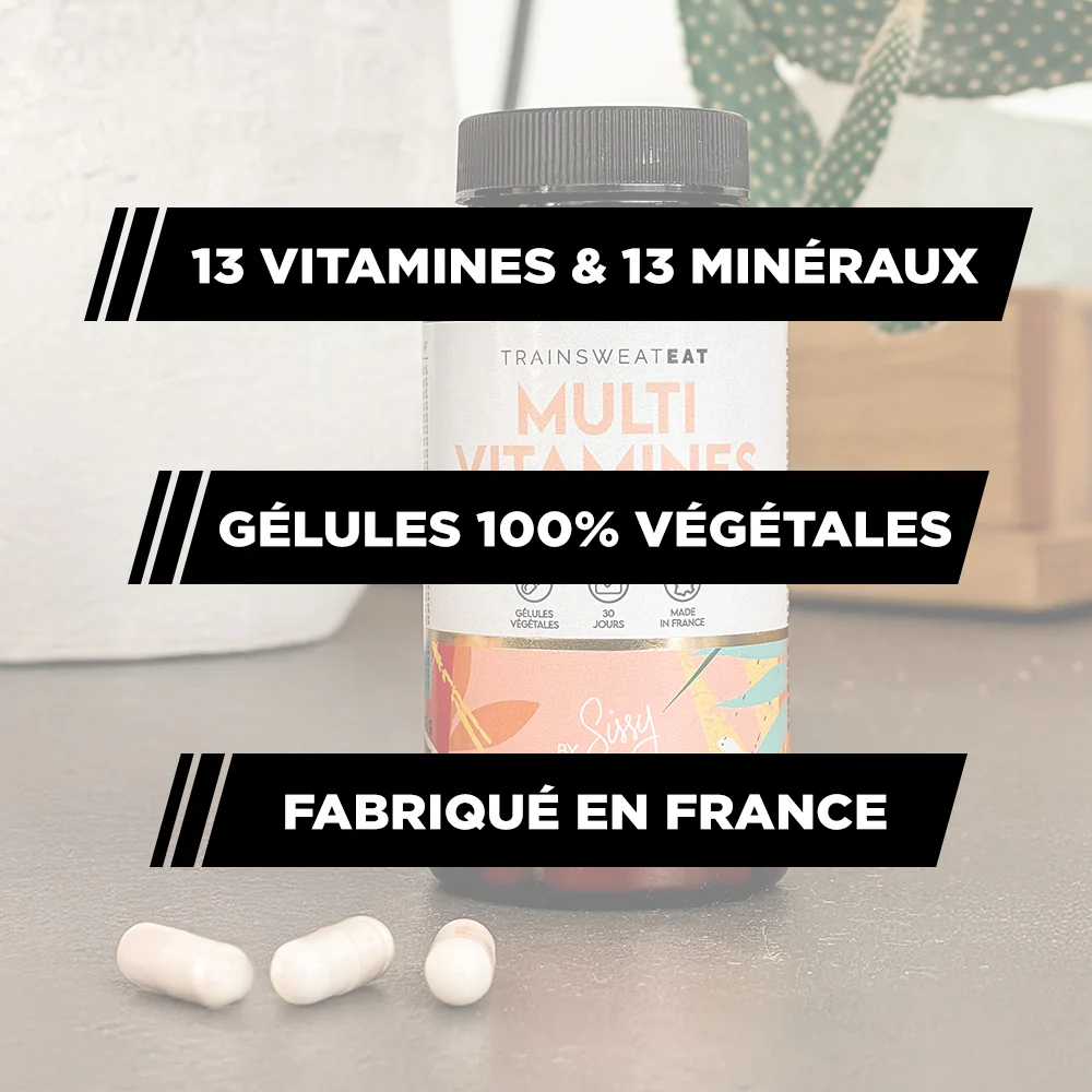 Le Multi Vitamines de TrainSweatEat, c’est un complexe de 13 vitamines et 13 minéraux qui va vous aider à couvrir vos besoins journaliers en nutriments essentiels.
