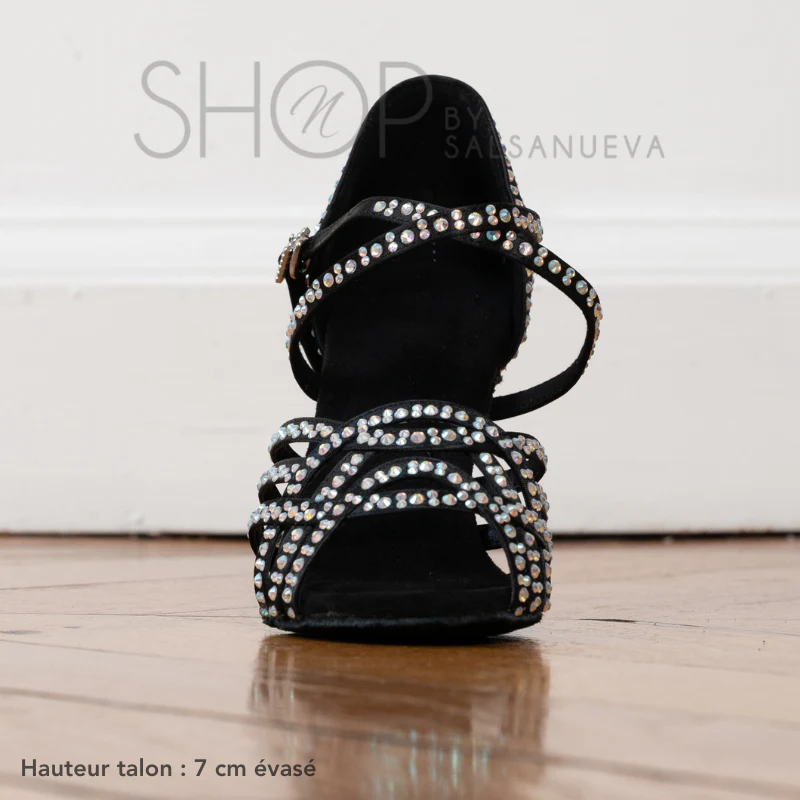 Les Chaussures de Danses Latine « Nuit Étoilée » de SalsaNueva Shop sont l’alliance parfaite entre sophistication et performance. Ces talons noirs sont incrustés de strass multicolores qui reflètent la lumière à chaque mouvement, vous permettant de briller sur la piste de danse.