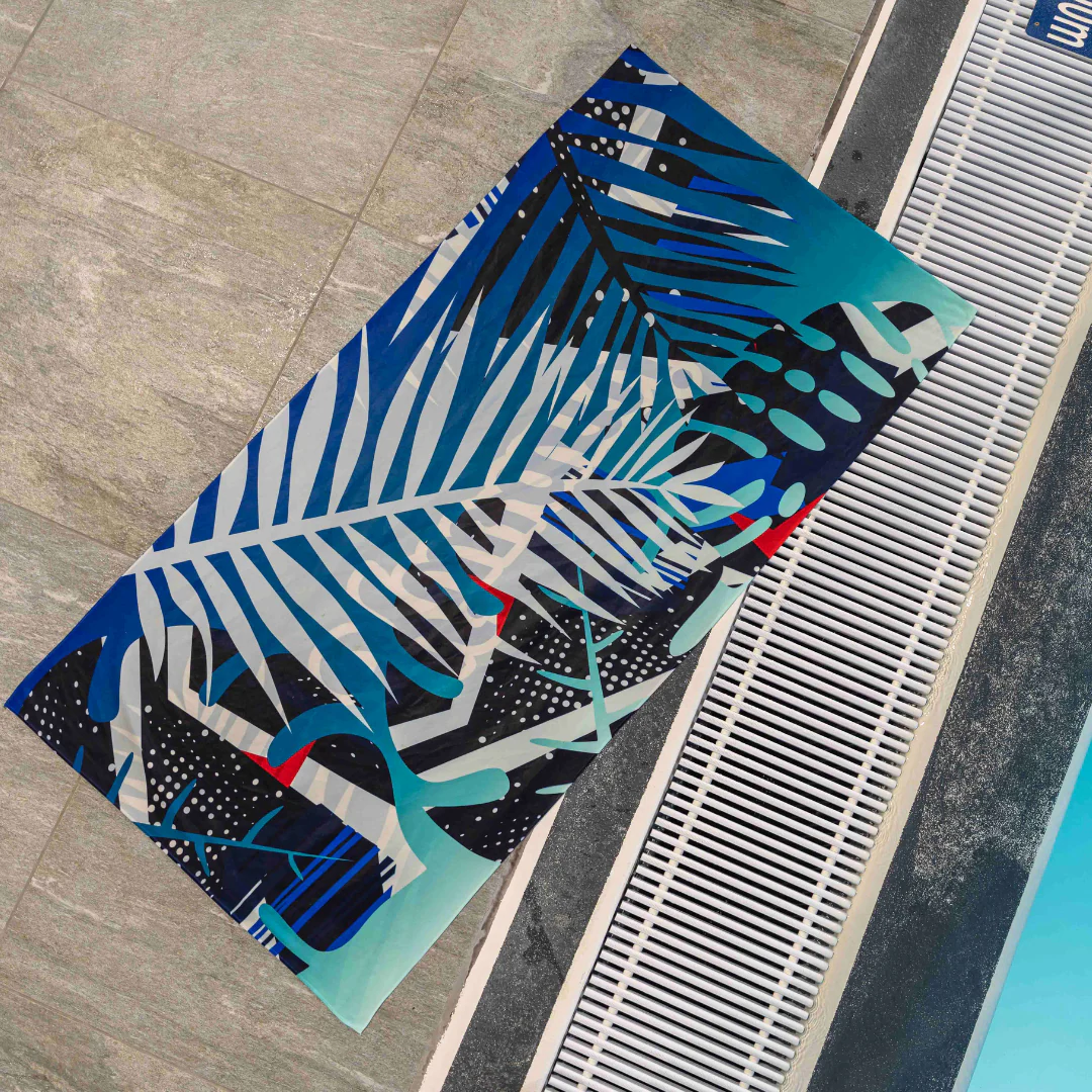Serviette en microfibre « Lanzarote » pour les triathlètes recherchant une serviette de grande taille, au dessin original et séchant rapidement. Cette serviette anti-sable est sublimée dans notre atelier de Montardon et vous accompagnera à la piscine, à la plage et à la salle de sport.
