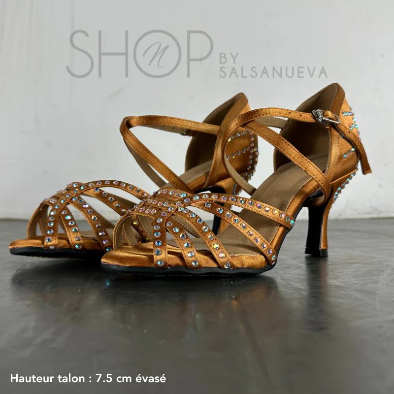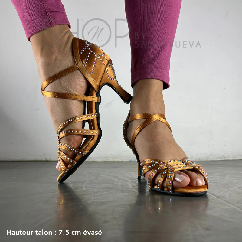 Les Chaussures de Danses Latines “Strass Bronze Étincelant” sont l’alliance parfaite entre chaleur et élégance, proposées par SalsaNueva Shop. Conçues pour les danseuses qui souhaitent attirer tous les regards sur la piste, ces chaussures combinent brillance subtile et confort exceptionnel.