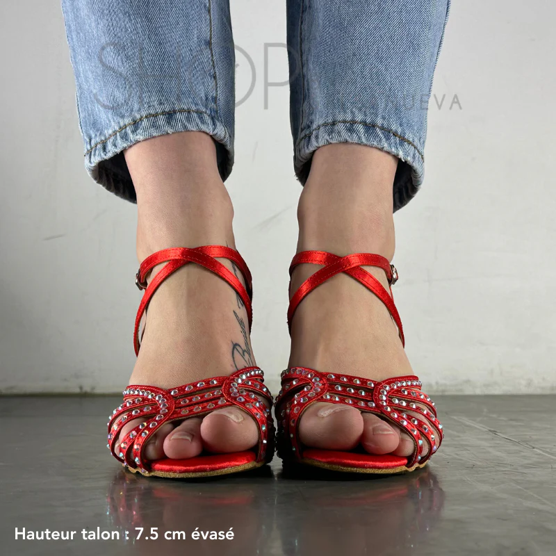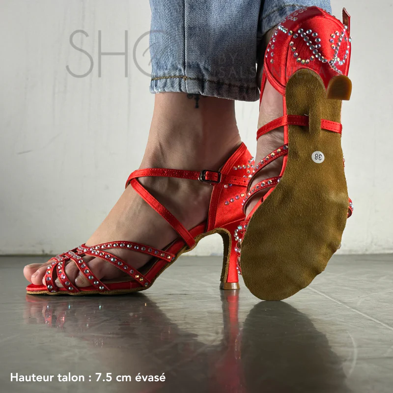 Les Chaussures de Danses Latines “Strass Rouge” incarnent la passion et l’audace, proposées par SalsaNueva Shop. Conçues pour les danseuses qui veulent captiver tous les regards, ces chaussures combinent un design flamboyant et un confort exceptionnel pour briller sur chaque piste.
