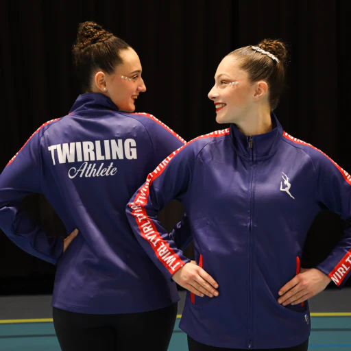 Veste d’entrainement avec bande marquage « Twirl » sur les bras, logo Twirler sur le coeur et ‘Twirling Athlete’ dans le dos.